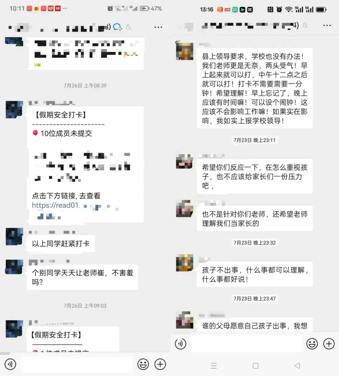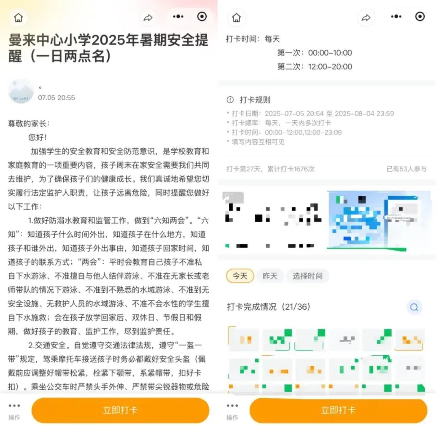 不同学校的打卡方式并不一样,有的是阅读“防溺水文字提示内容”,有的是观看防溺水视频,有的甚至规定了打卡的具体时间段,若未按时完成打卡,则会收到老师在班级群中的点名提醒或电话催促。